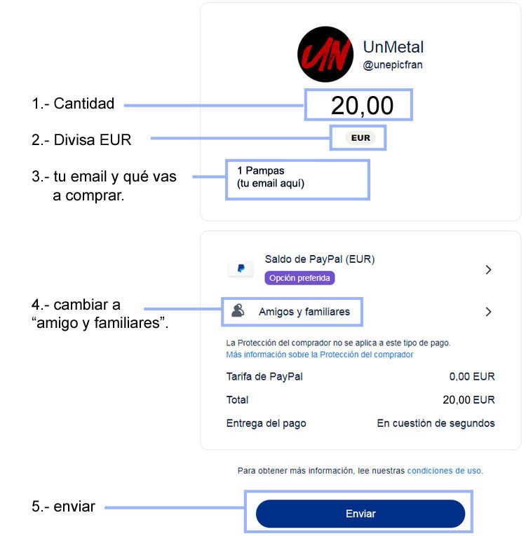 4.- Cambia "Bienes y servicios / Goods and services" por "para amigos o familiares / For friends and family" para evitar que Paypal no se quede con una parte del pago.